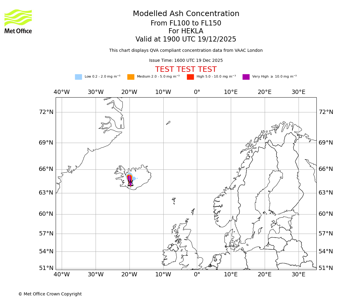 Modelled ash concentration from 100 to 150 for HEKLA. Valid at 1600 UTC 19/12/2025