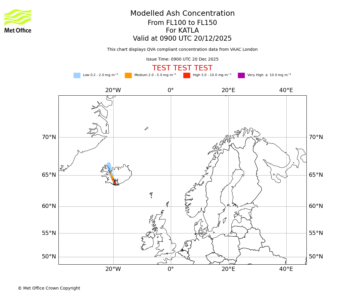 Modelled ash concentration from 100 to 150 for KATLA. Valid at 1200 UTC 20/12/2025