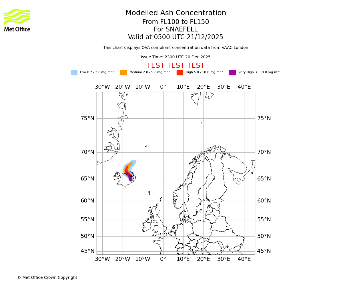 Modelled ash concentration from 100 to 150 for SNAEFELL. Valid at 0200 UTC 21/12/2025