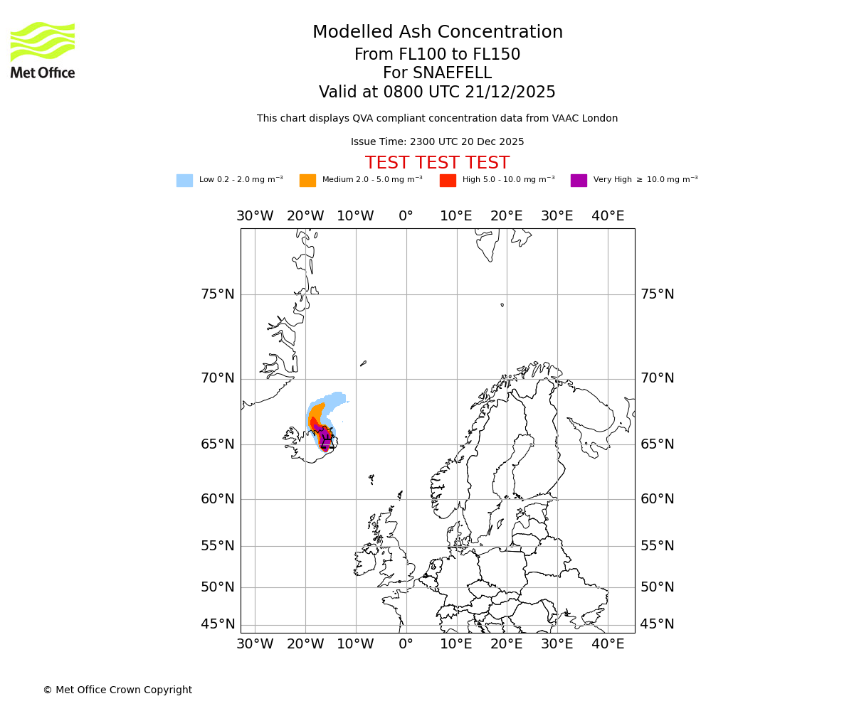Modelled ash concentration from 100 to 150 for SNAEFELL. Valid at 0500 UTC 21/12/2025