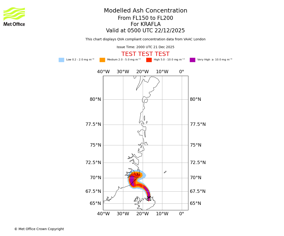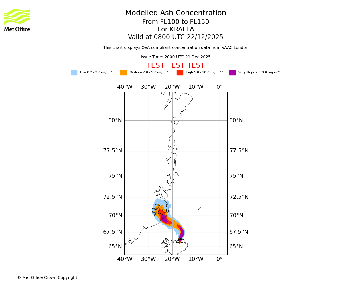 Modelled ash concentration from 100 to 150 for KRAFLA. Valid at 0500 UTC 22/12/2025