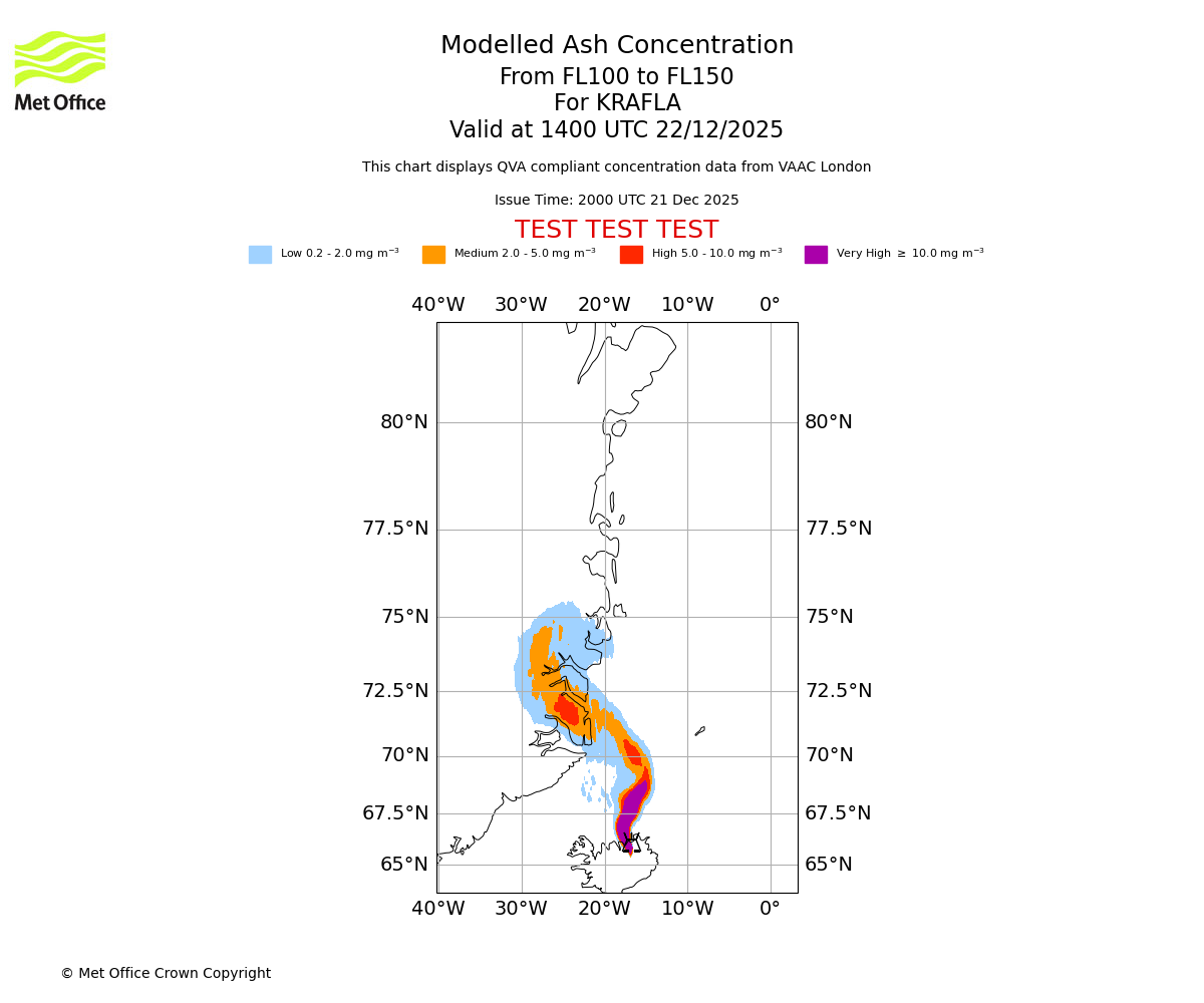 Modelled ash concentration from 100 to 150 for KRAFLA. Valid at 1100 UTC 22/12/2025