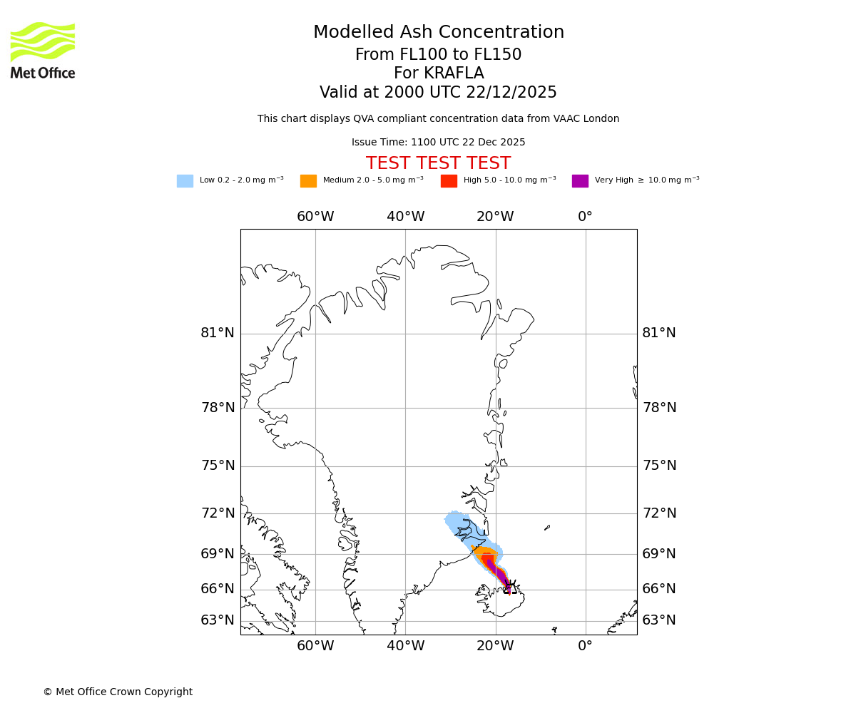 Modelled ash concentration from 000 to 200 for KRAFLA. Valid at 1100 UTC 22/12/2025