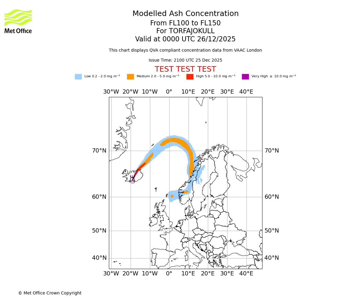 Modelled ash concentration from 100 to 150 for TORFAJOKULL. Valid at 2100 UTC 25/12/2025