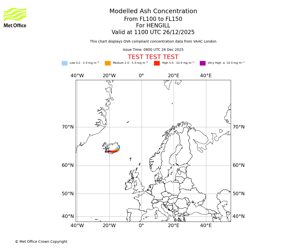 Modelled ash concentration from 100 to 150 for HENGILL. Valid at 0800 UTC 26/12/2025