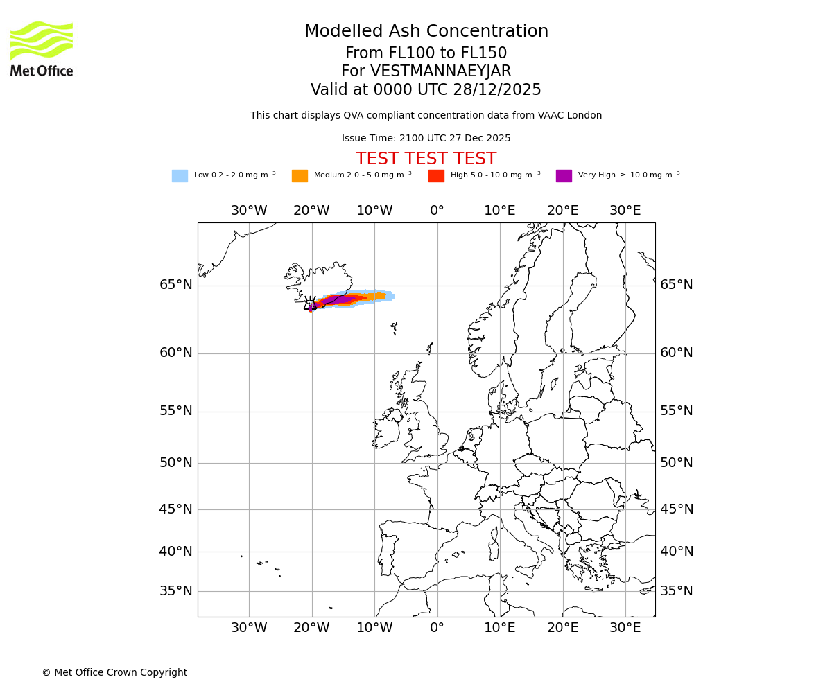 Modelled ash concentration from 100 to 150 for VESTMANNAEYJAR. Valid at 2100 UTC 27/12/2025