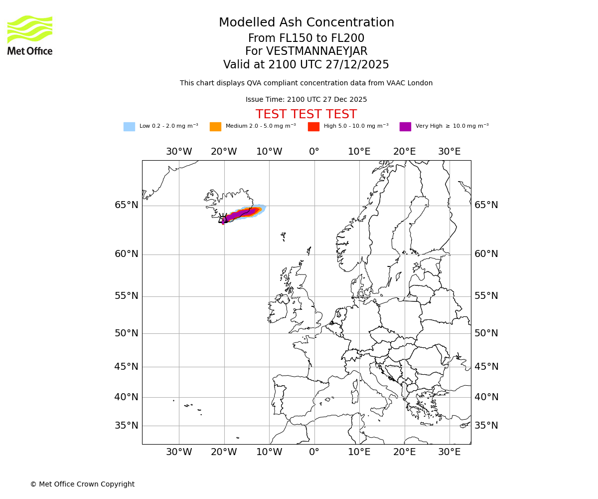 Modelled ash concentration from 000 to 200 for VESTMANNAEYJAR. Valid at 2100 UTC 27/12/2025