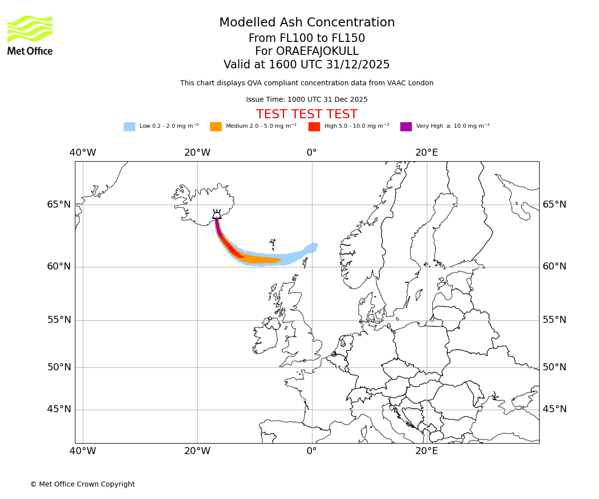 Modelled ash concentration from 100 to 150 for ORAEFAJOKULL. Valid at 1300 UTC 31/12/2025