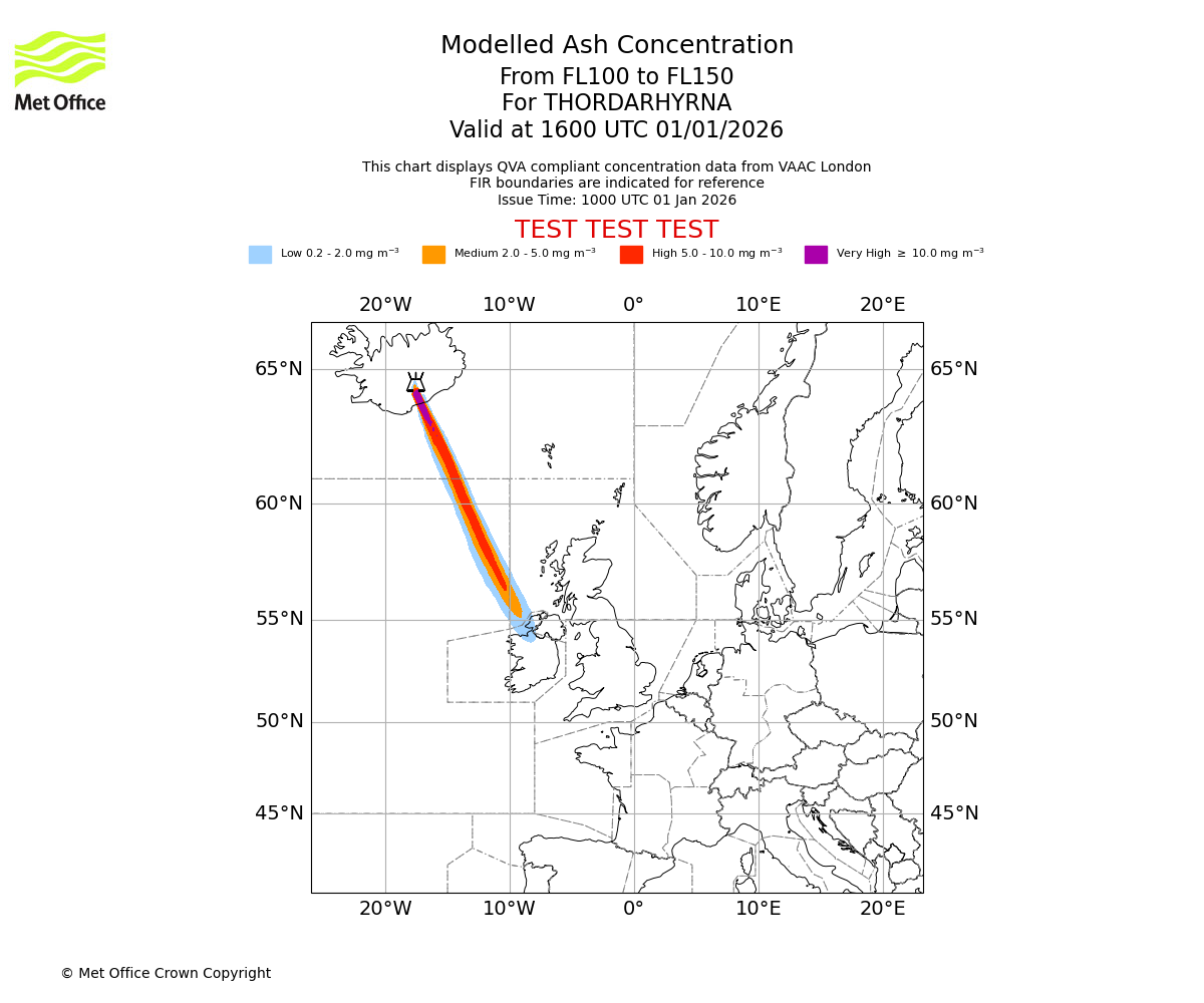 Modelled ash concentration from 100 to 150 for THORDARHYRNA. Valid at 1300 UTC 01/01/2026