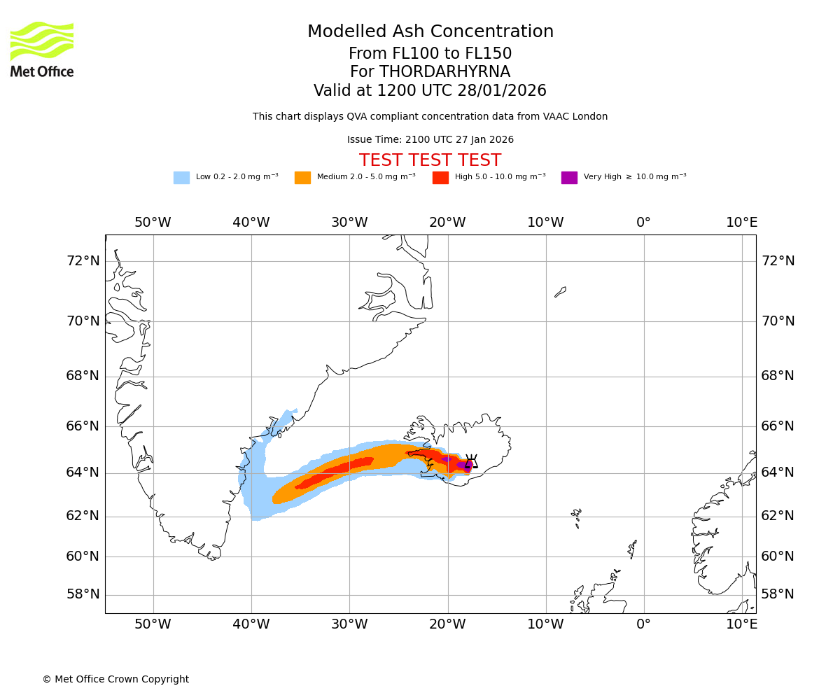 Modelled ash concentration from 100 to 150 for THORDARHYRNA. Valid at 0900 UTC 28/01/2026