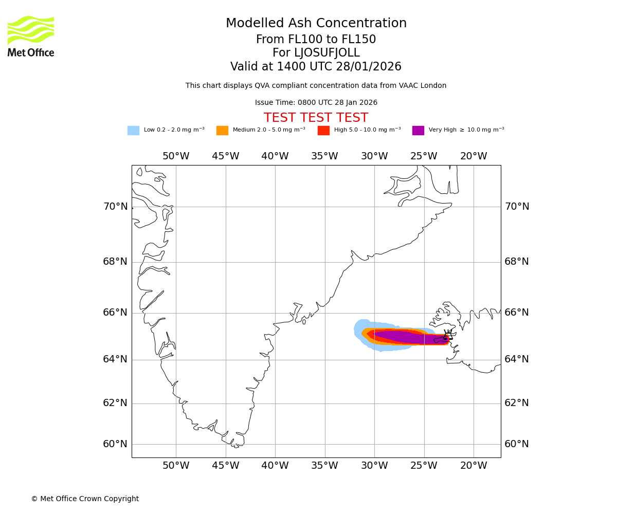Modelled ash concentration from 100 to 150 for LJOSUFJOLL. Valid at 1100 UTC 28/01/2026