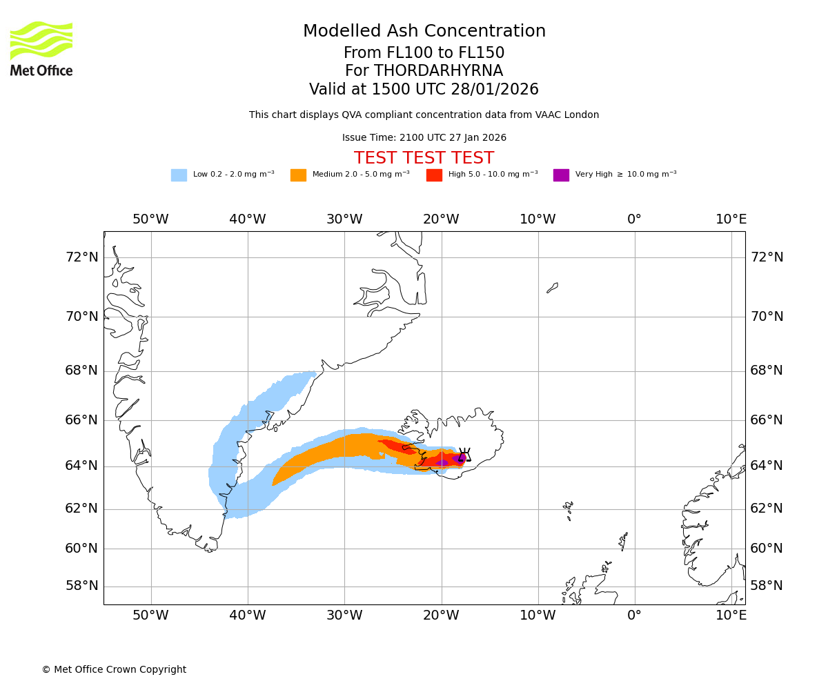 Modelled ash concentration from 100 to 150 for THORDARHYRNA. Valid at 1200 UTC 28/01/2026