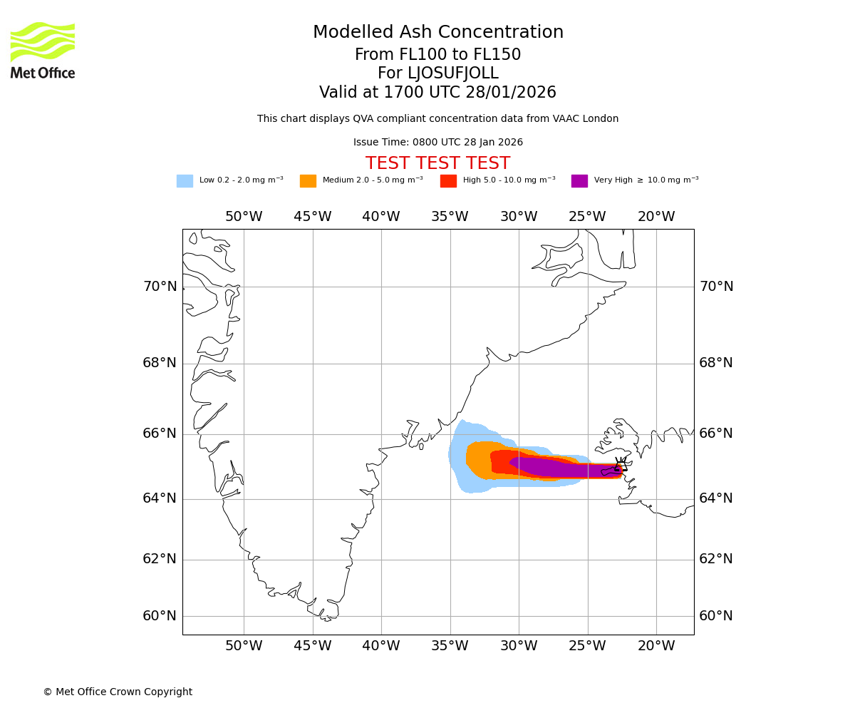 Modelled ash concentration from 100 to 150 for LJOSUFJOLL. Valid at 1400 UTC 28/01/2026
