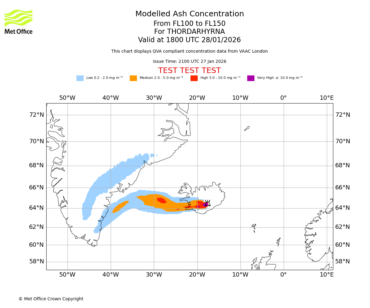 Modelled ash concentration from 100 to 150 for THORDARHYRNA. Valid at 1500 UTC 28/01/2026