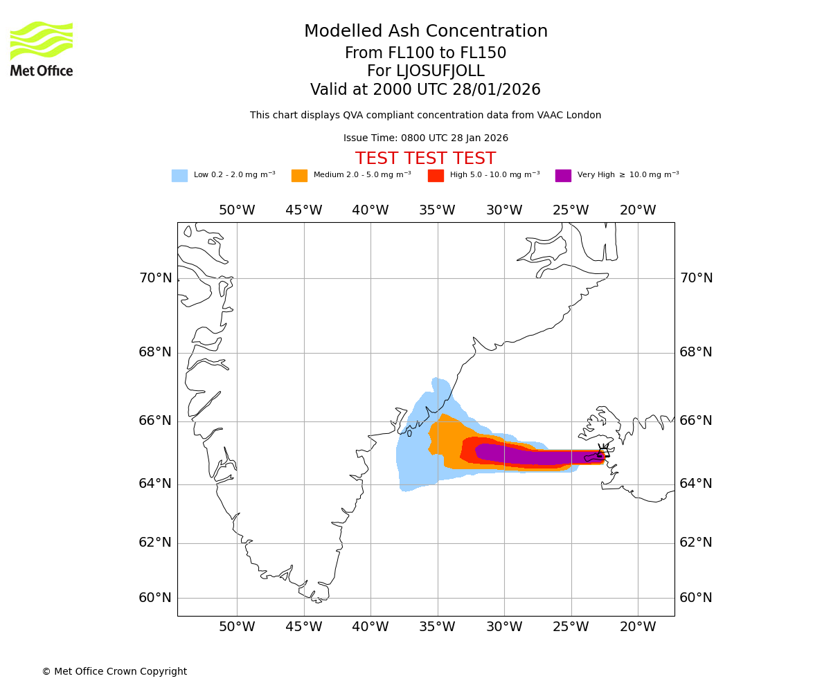 Modelled ash concentration from 000 to 200 for LJOSUFJOLL. Valid at 0800 UTC 28/01/2026