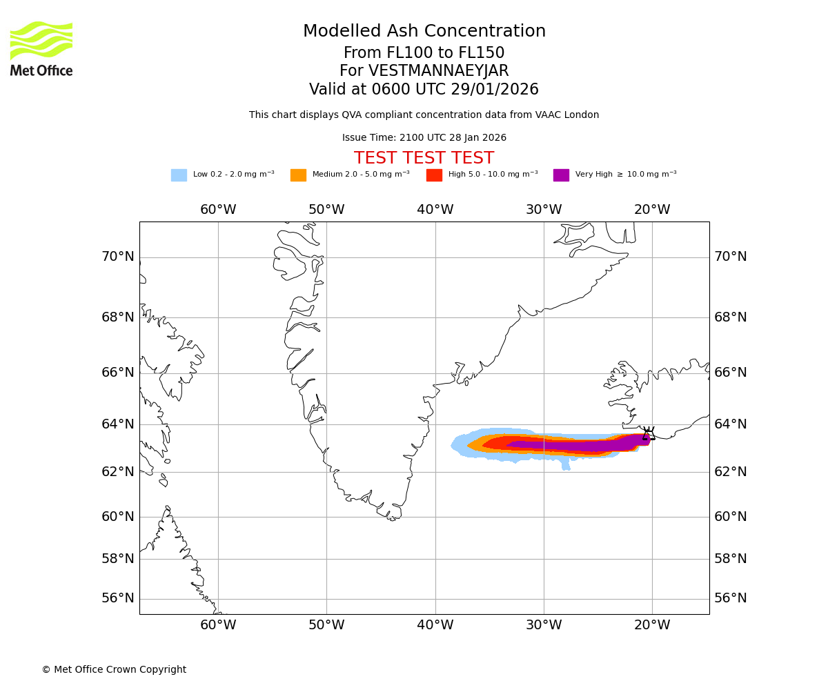 Modelled ash concentration from 100 to 150 for VESTMANNAEYJAR. Valid at 0300 UTC 29/01/2026