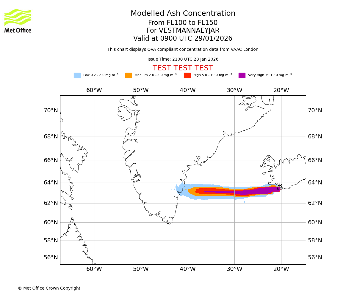 Modelled ash concentration from 100 to 150 for VESTMANNAEYJAR. Valid at 0600 UTC 29/01/2026