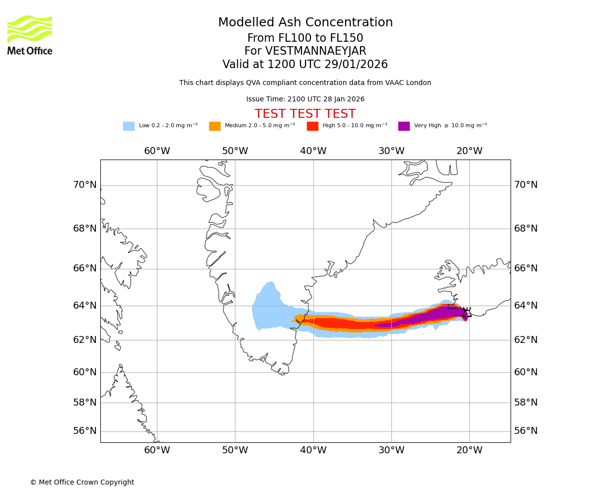 Modelled ash concentration from 100 to 150 for VESTMANNAEYJAR. Valid at 0900 UTC 29/01/2026