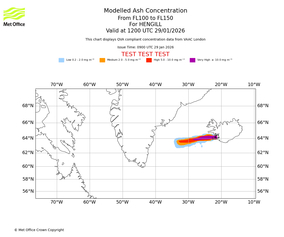 Modelled ash concentration from 100 to 150 for HENGILL. Valid at 1500 UTC 29/01/2026