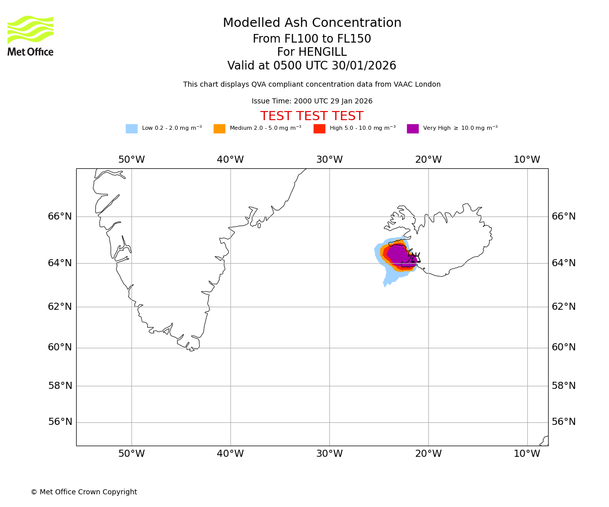 Modelled ash concentration from 100 to 150 for HENGILL. Valid at 0200 UTC 30/01/2026