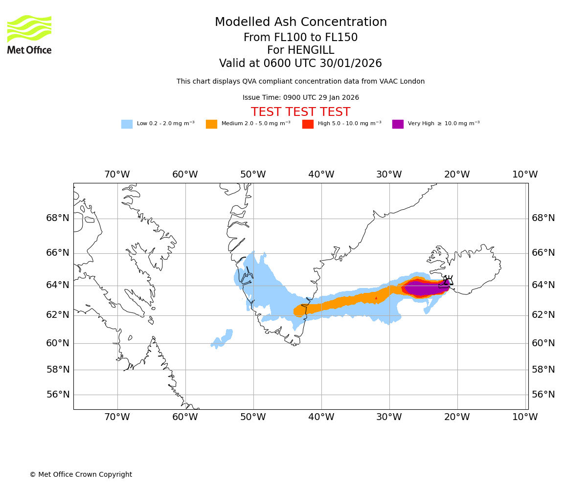 Modelled ash concentration from 100 to 150 for HENGILL. Valid at 0300 UTC 30/01/2026