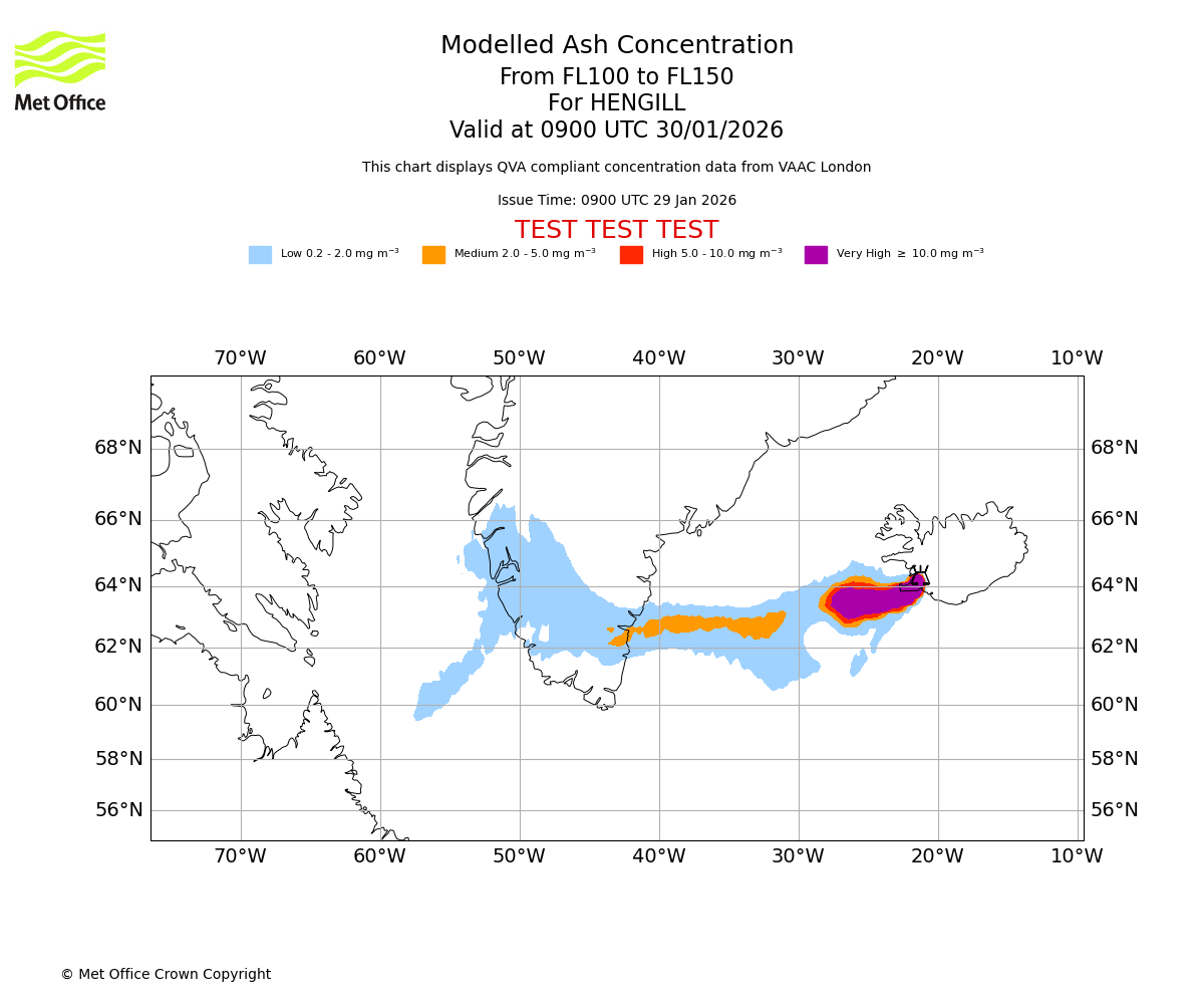 Modelled ash concentration from 000 to 200 for HENGILL. Valid at 0900 UTC 29/01/2026