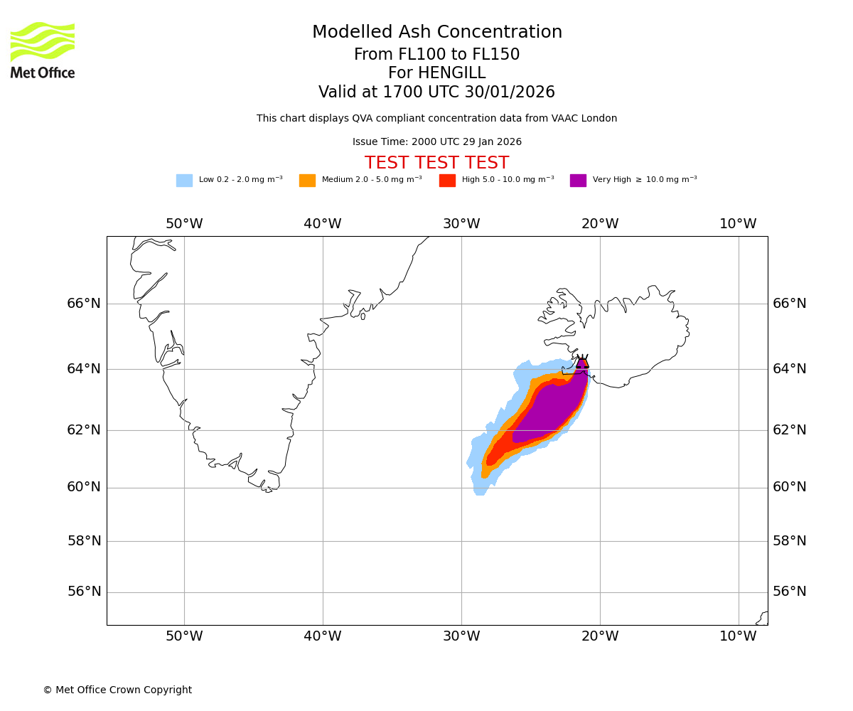 Modelled ash concentration from 100 to 150 for HENGILL. Valid at 1400 UTC 30/01/2026