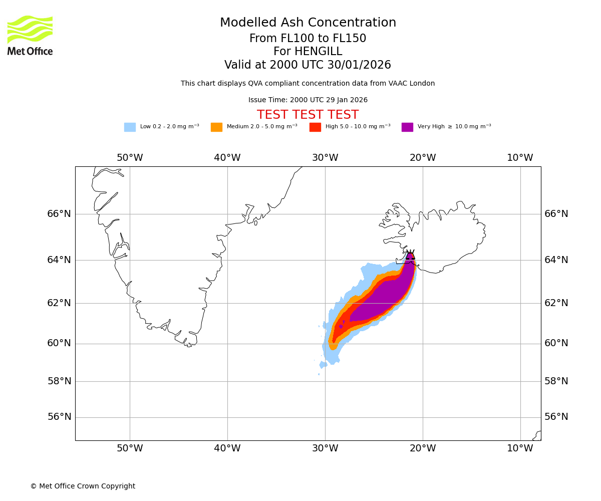 Modelled ash concentration from 000 to 200 for HENGILL. Valid at 2000 UTC 29/01/2026