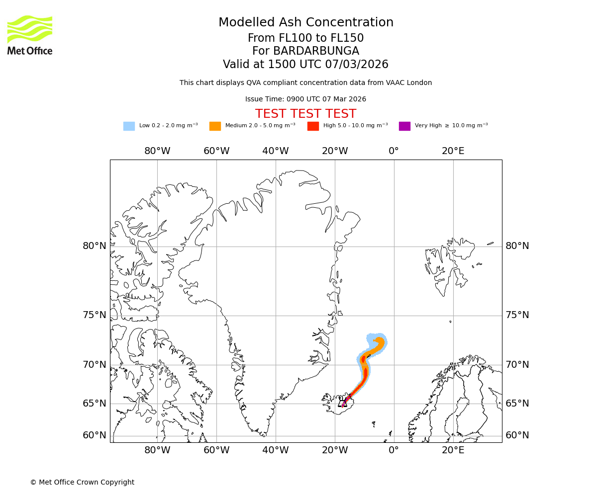 Modelled ash concentration from 100 to 150 for BARDARBUNGA. Valid at 1200 UTC 07/03/2026