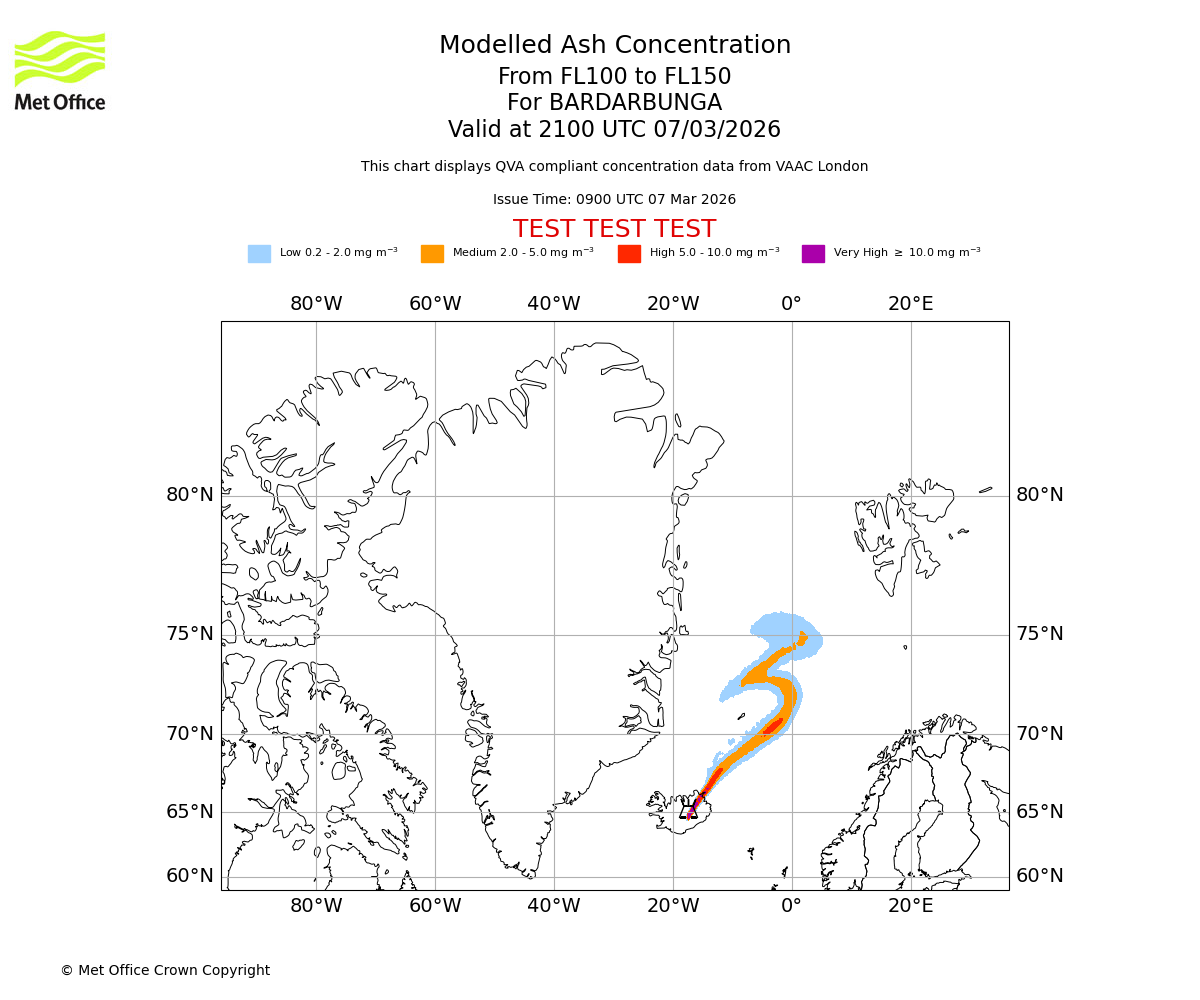 Modelled ash concentration from 000 to 200 for BARDARBUNGA. Valid at 0900 UTC 07/03/2026