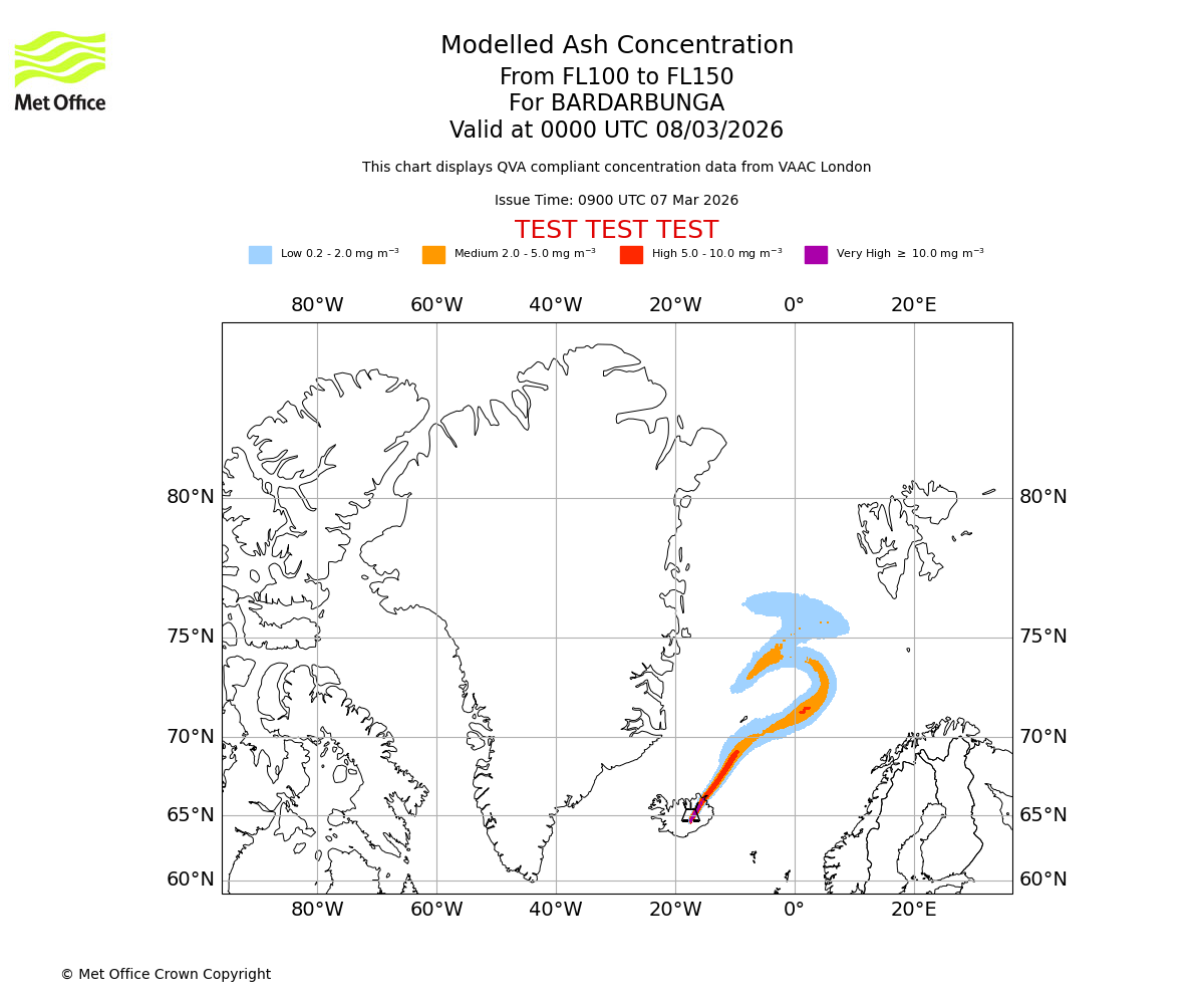 Modelled ash concentration from 000 to 200 for BARDARBUNGA. Valid at 0900 UTC 07/03/2026