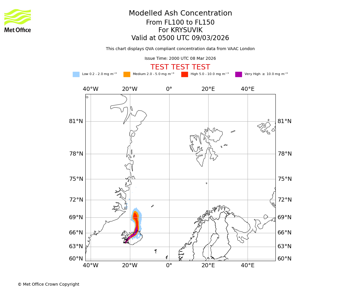 Modelled ash concentration from 100 to 150 for KRYSUVIK. Valid at 0200 UTC 09/03/2026