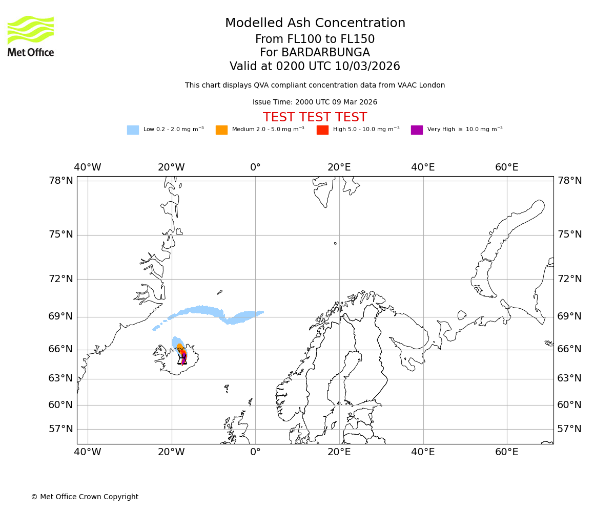 Modelled ash concentration from 100 to 150 for BARDARBUNGA. Valid at 2300 UTC 09/03/2026