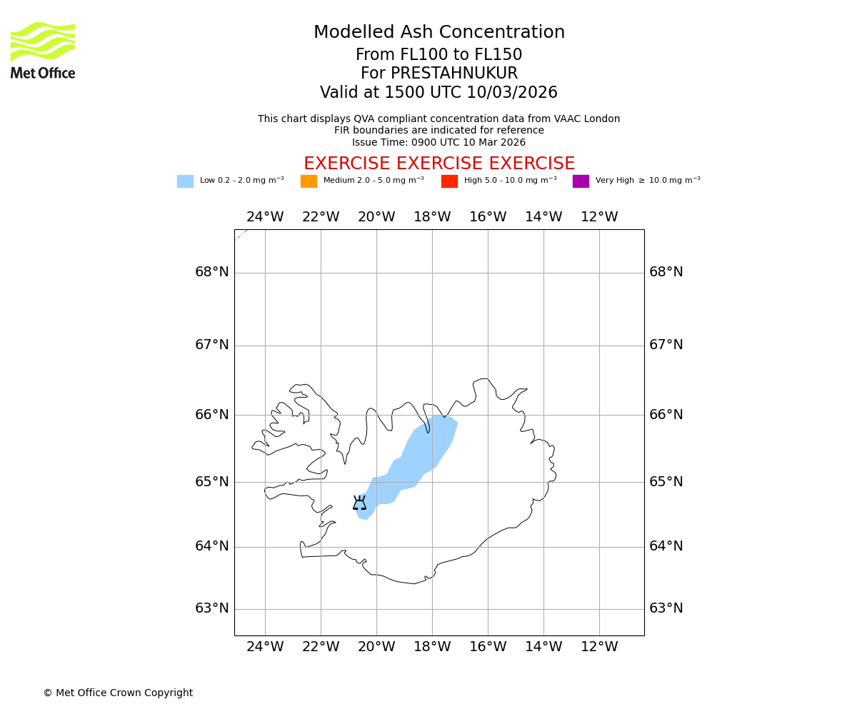 Modelled ash concentration from 100 to 150 for PRESTAHNUKUR. Valid at 1200 UTC 10/03/2026