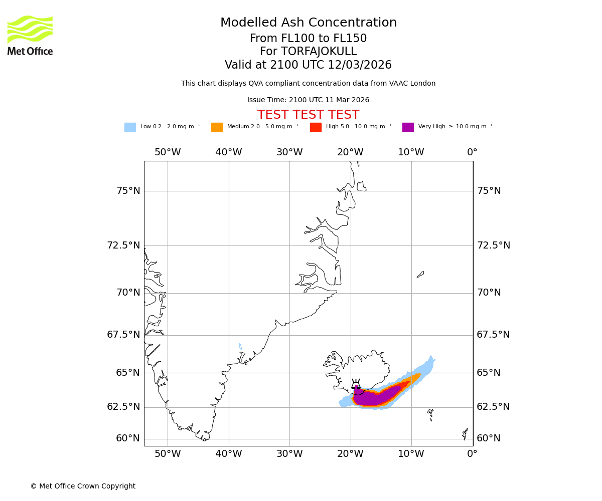 Modelled ash concentration from 100 to 150 for TORFAJOKULL. Valid at 1800 UTC 12/03/2026