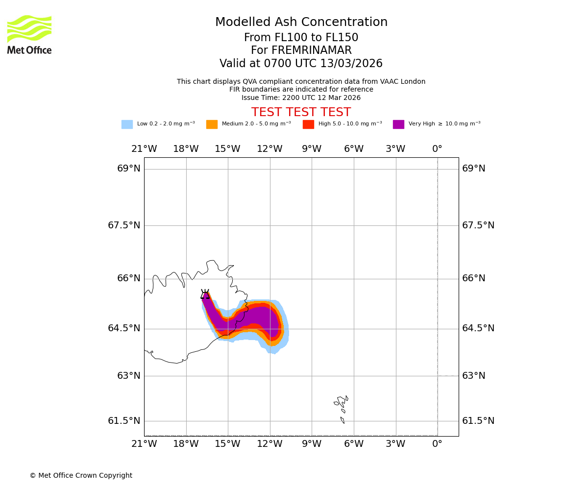 Modelled ash concentration from 000 to 200 for FREMRINAMAR. Valid at 2200 UTC 12/03/2026