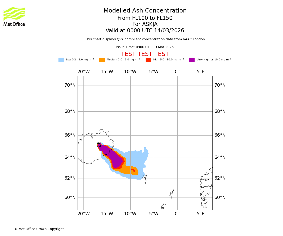 Modelled ash concentration from 100 to 150 for ASKJA. Valid at 2100 UTC 13/03/2026