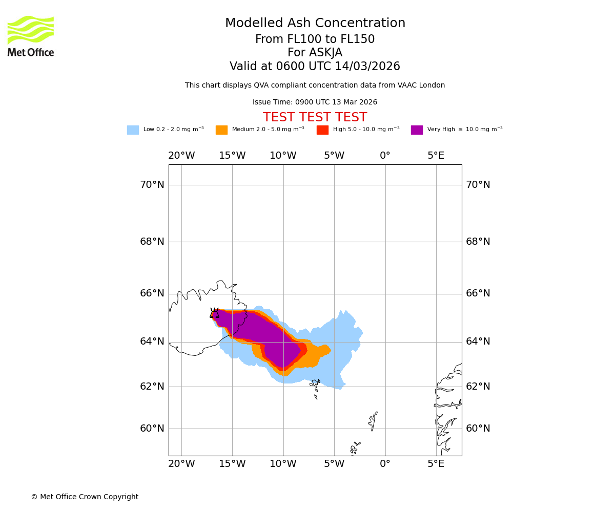 Modelled ash concentration from 100 to 150 for ASKJA. Valid at 0300 UTC 14/03/2026