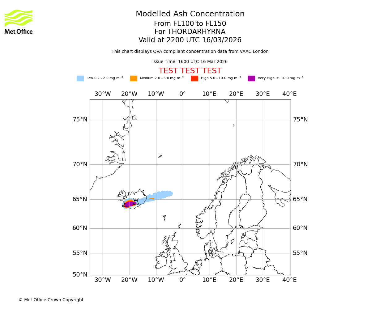 Modelled ash concentration from 100 to 150 for THORDARHYRNA. Valid at 1900 UTC 16/03/2026