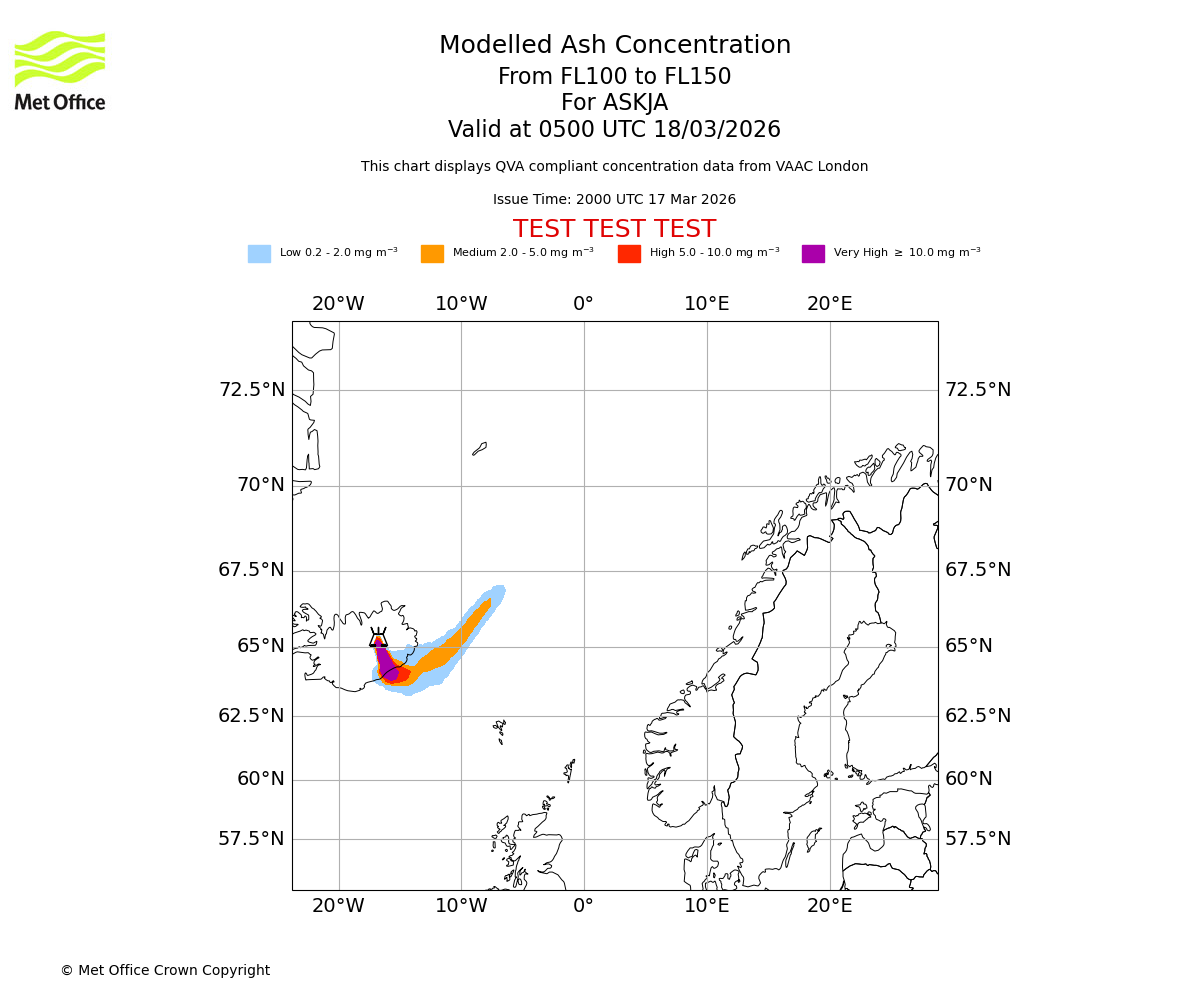 Modelled ash concentration from 100 to 150 for ASKJA. Valid at 0200 UTC 18/03/2026