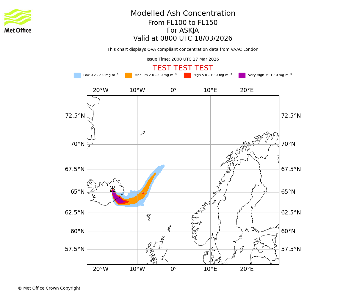 Modelled ash concentration from 100 to 150 for ASKJA. Valid at 0500 UTC 18/03/2026