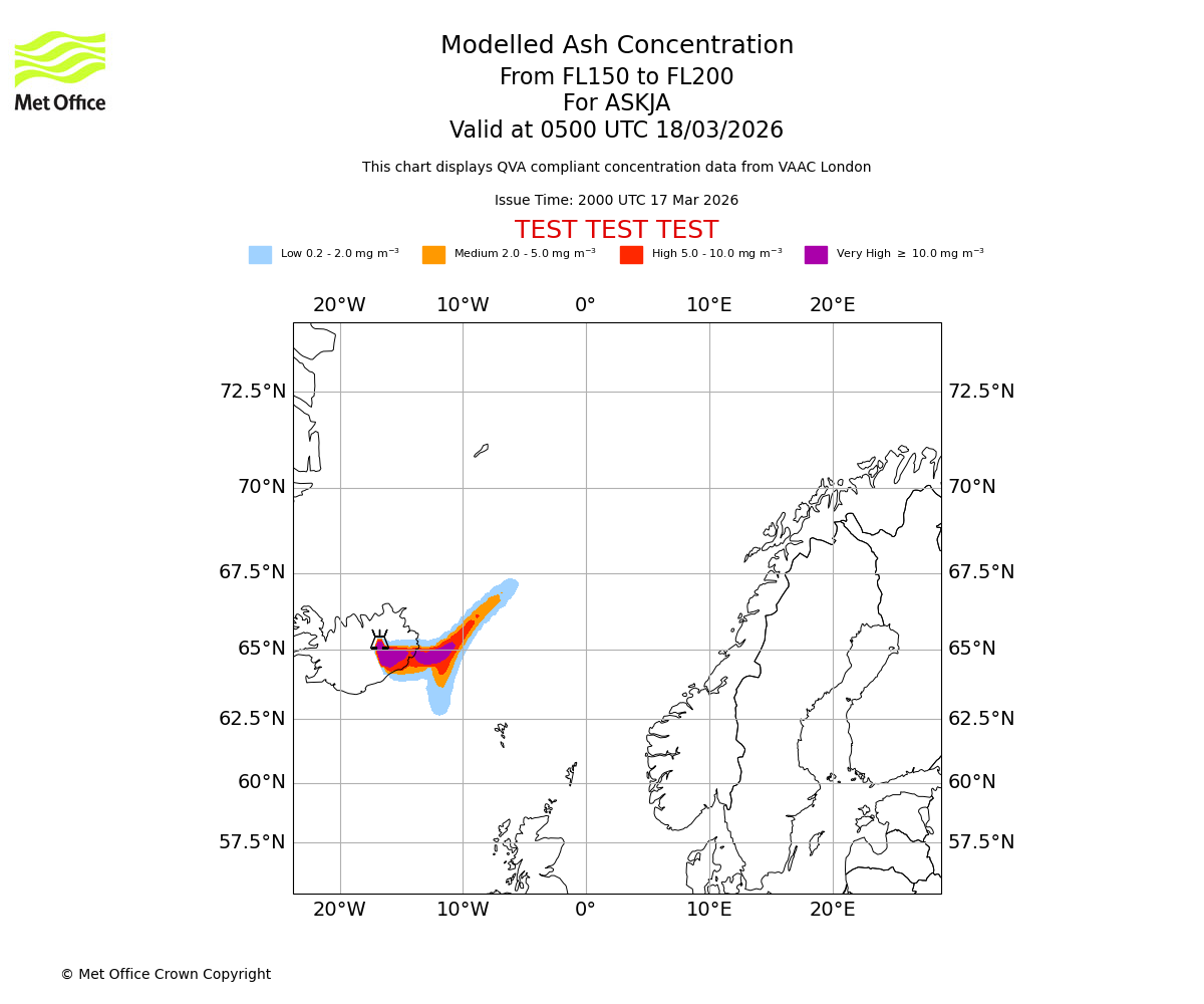 Modelled ash concentration from 000 to 200 for ASKJA. Valid at 2000 UTC 17/03/2026