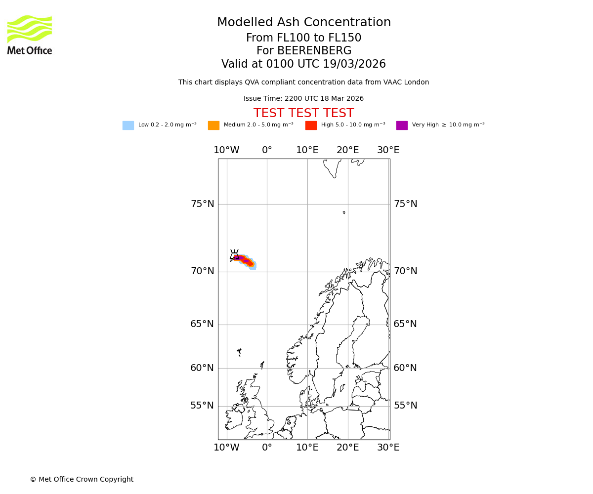 Modelled ash concentration from 100 to 150 for BEERENBERG. Valid at 2200 UTC 18/03/2026