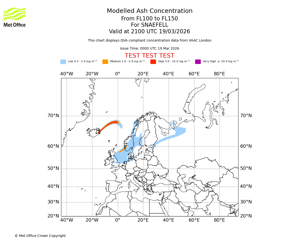 Modelled ash concentration from 100 to 150 for SNAEFELL. Valid at 1800 UTC 19/03/2026