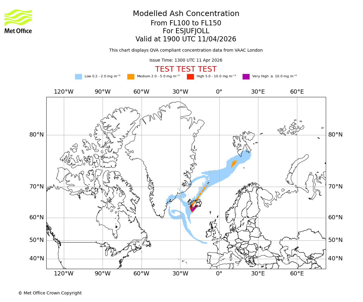 Modelled ash concentration from 100 to 150 for ESJUFJOLL. Valid at 1600 UTC 11/04/2026