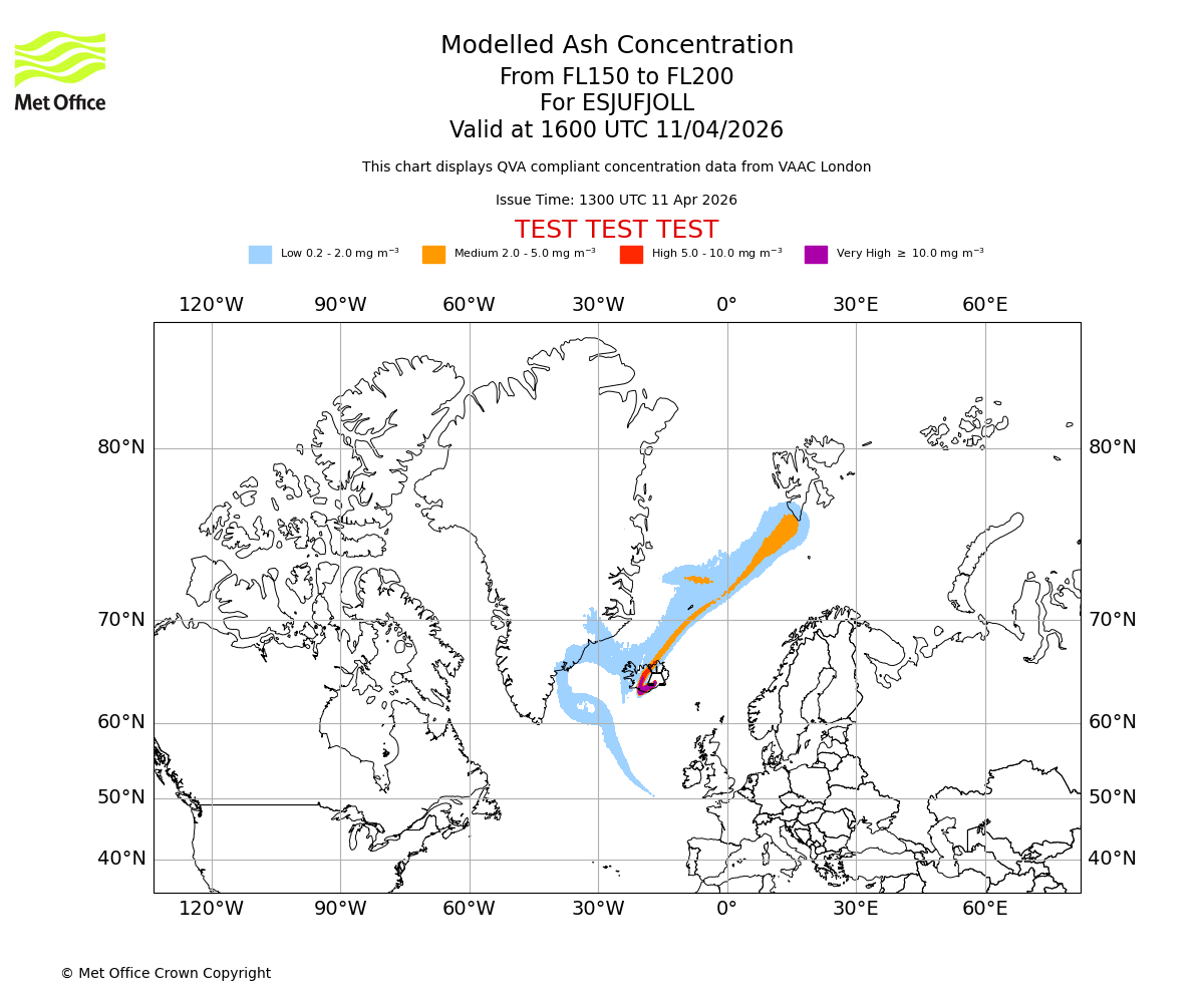 Modelled ash concentration from 000 to 200 for ESJUFJOLL. Valid at 1300 UTC 11/04/2026