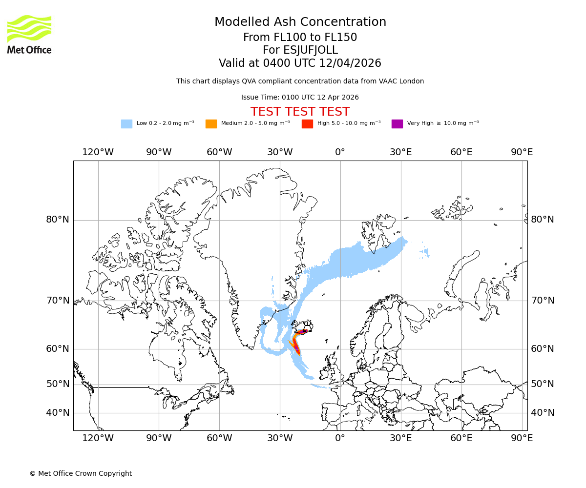 Modelled ash concentration from 100 to 150 for ESJUFJOLL. Valid at 0100 UTC 12/04/2026
