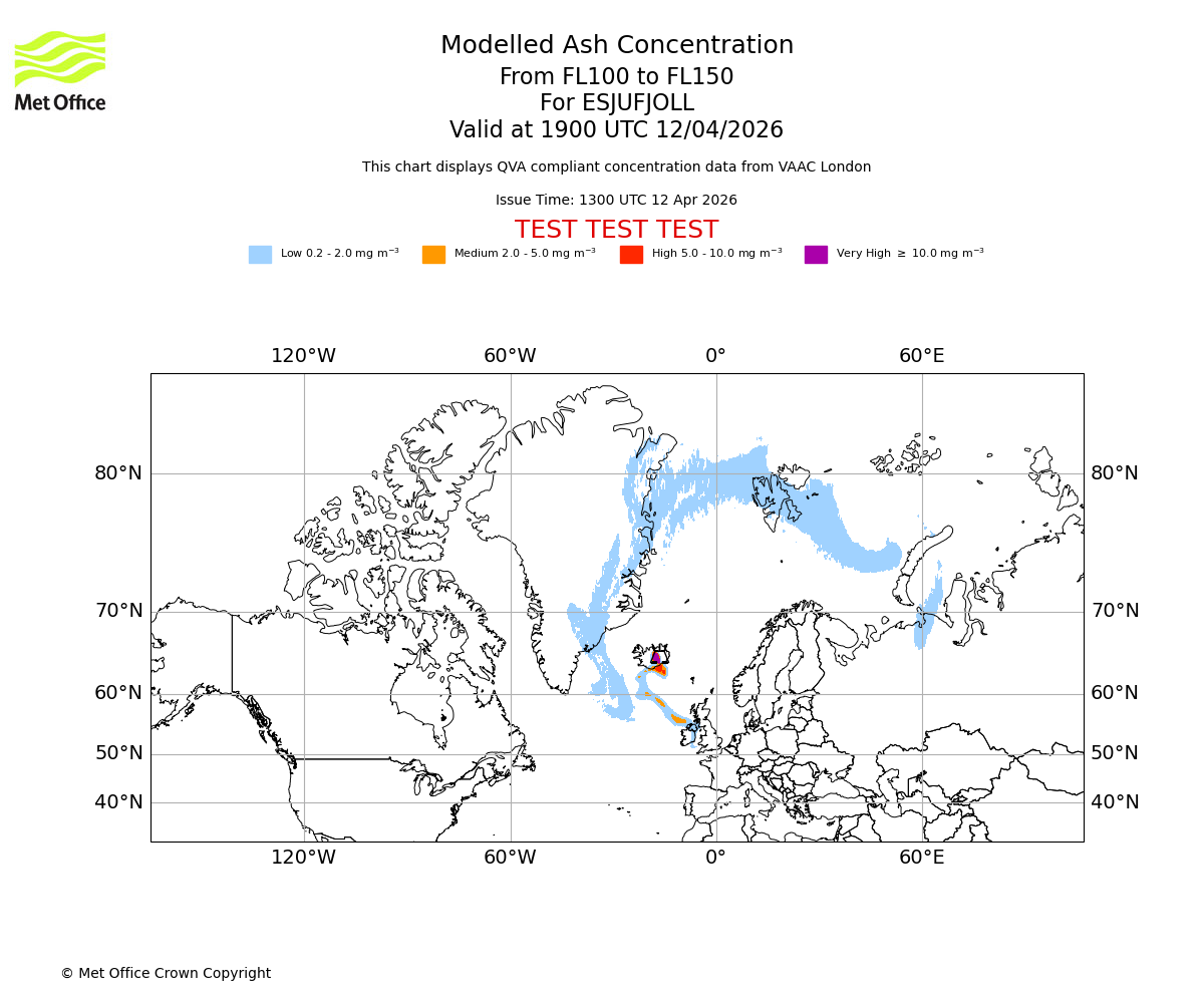 Modelled ash concentration from 100 to 150 for ESJUFJOLL. Valid at 1600 UTC 12/04/2026