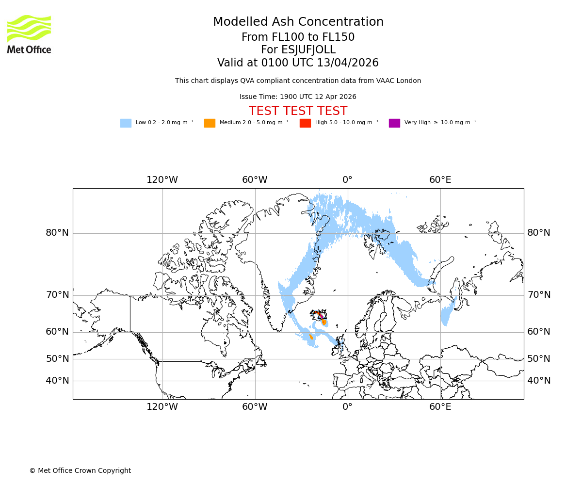 Modelled ash concentration from 100 to 150 for ESJUFJOLL. Valid at 2200 UTC 12/04/2026