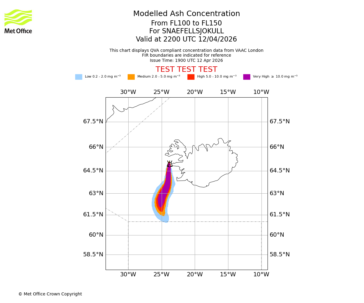 Modelled ash concentration from 000 to 200 for SNAEFELLSJOKULL. Valid at 1900 UTC 12/04/2026